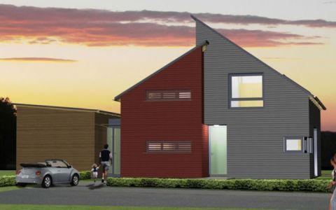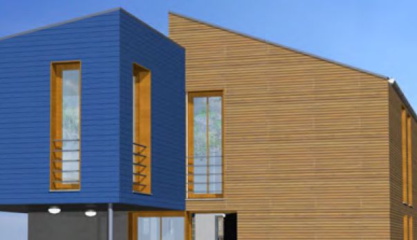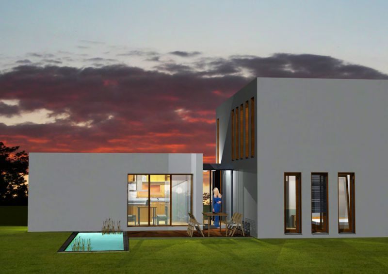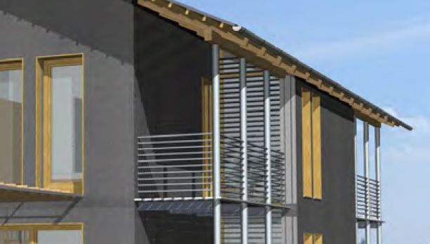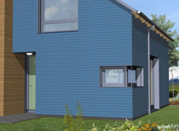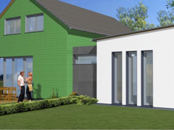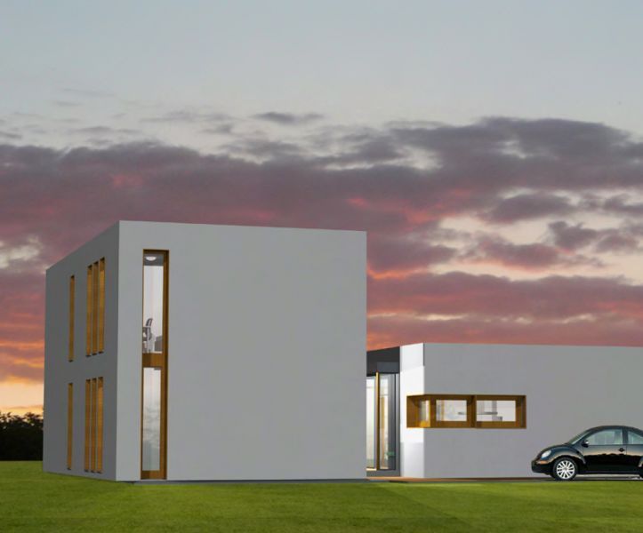 Extravagant im Ausdruck präsentiert sich der Doppelhaustyp "Osthimmel". Strenge Form, ganz ohne Überstände, liebevoll gesetzte Öffnungen und reizvolle Übergänge in den Außenraum. Das Innere der Häuser setzt das innovative Formenspiel fort – minimale Verkehrsflächen, fließende Räume bis zum großzügigen Terrassenbereich. Im Obergeschoss finden drei Zimmer und ein Bad Platz. In Anordnung und Ausrichtung setzt das Doppelhaus "Osthimmel" ganz auf Einsparung von Aufwand, Außenflächen und Energie bei maximaler Privatsphäre.