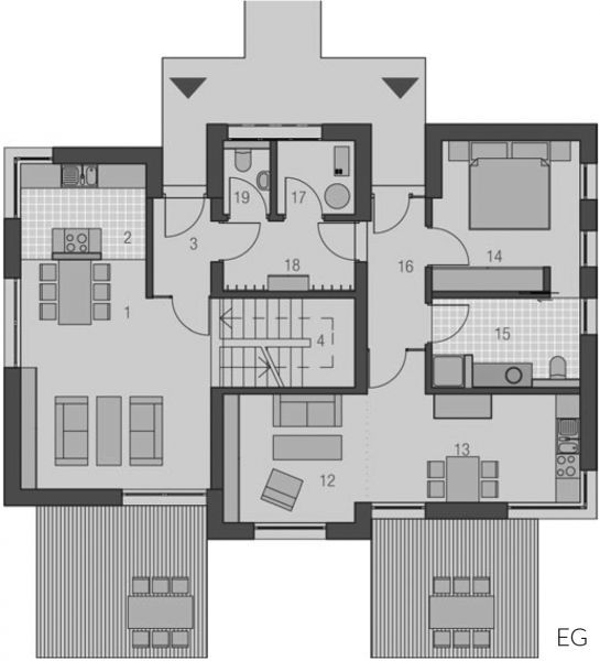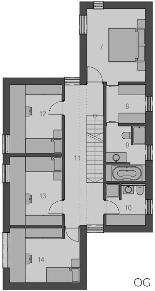 Mit dem geradlinig-schlichten Haustyp "Sterntaler" findet die individuelle Familie ein hohes Maß an Privatsphäre und ein fein differenziertes Raumprogramm. Die zwischen den Baukörpern geborgene Terrasse steht im engen Raumbezug zum gesondert angeordneten, flacheren Wohnbaukörper. Im Hauptbau ist viel Platz für das Private. Elternschlafzimmer und Bad verschaffen sich angenehmen Abstand zu den öffentlicheren Bereichen – dabei bleiben sie doch auf Erdgeschossebene. Im Obergeschoss haben die Kinder ihr eigenes Reich zur freien Entfaltung.