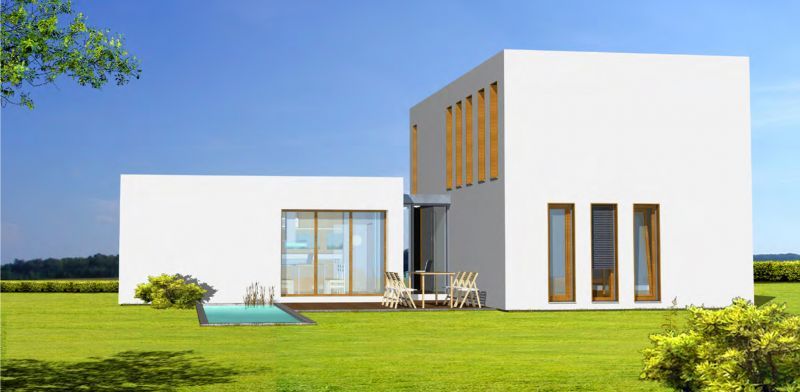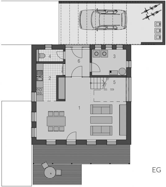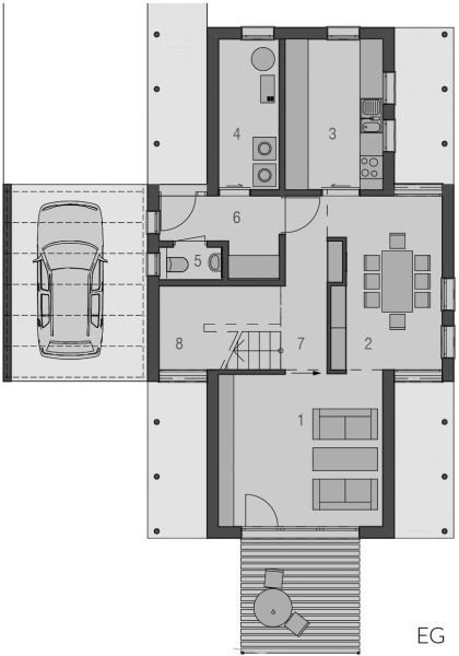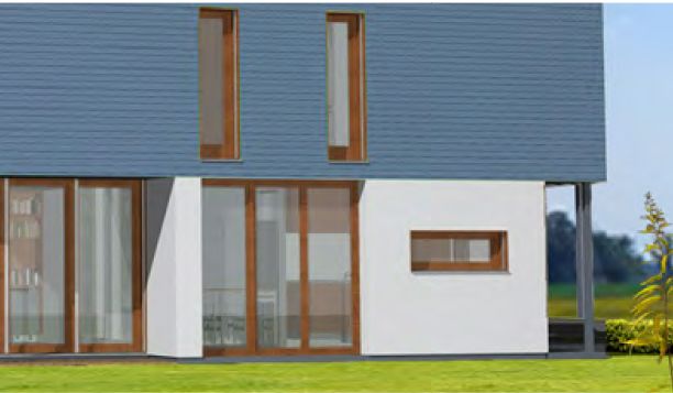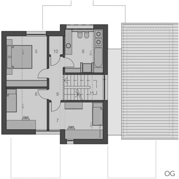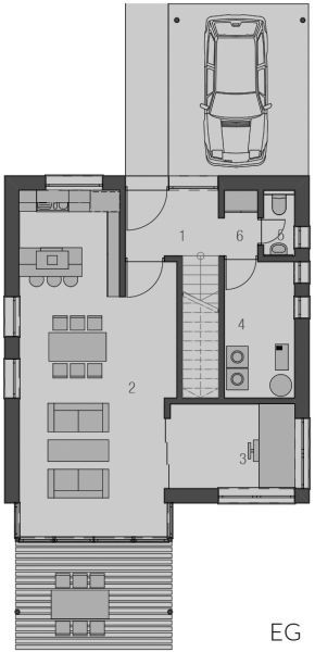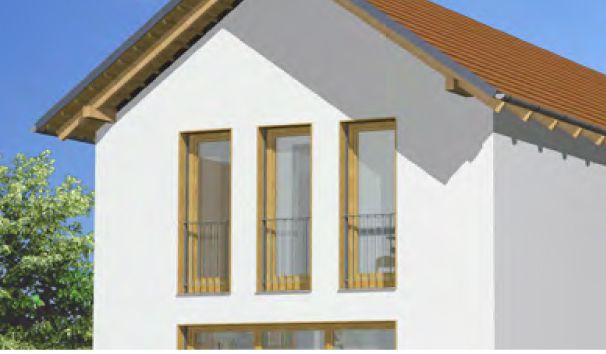 Der Haustyp "Windstrom" zeichnet sich außen als klassischer Villentypus mit großem Dachüberstand und langgestreckten Fensterformaten aus, innen durch viel Raum und Licht auf kompakter Fläche. Ein offener Grundriss minimiert die Verkehrsflächen und schafft großzügige Raumsituationen, wie das zum Wohnzimmer offene, großzügig verglaste Treppenhaus. Die Ergänzung durch Terrasse und Balkon auf der dem Eingang abgewandten Seite ergänzt Baukörper und Funktion besonders reizvoll. Im Obergeschoss ist bei durchgehend voller Raumhöhe Platz für Eltern, Bad sowie zwei Kinderzimmer.