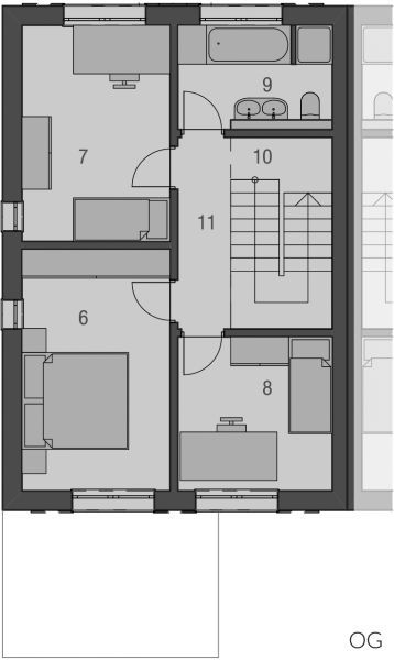 Der Haustyp "Nordlicht" bietet viel Privatsphäre und ein differenziertes Raumprogramm. In der Fassade setzt dieser Haustyp dabei eher auf die spielerisch-moderne Kombination traditioneller Elemente. Die zwischen den Baukörpern geborgene Terrasse geht fließend in den gesonderten Wohn- Essbereich über. Im Hauptbau ist viel Platz für das Private. Elternschlafzimmer und Bad verschaffen sich angenehmen Abstand zu den öffentlicheren Bereichen – dabei bleiben sie doch auf Erdgeschossebene. Im Obergeschoss haben die Kinder ihr eigenes Reich zur freien Entfaltung.