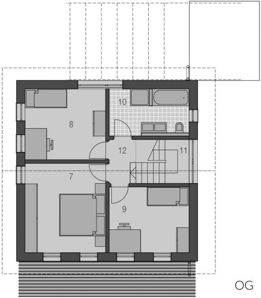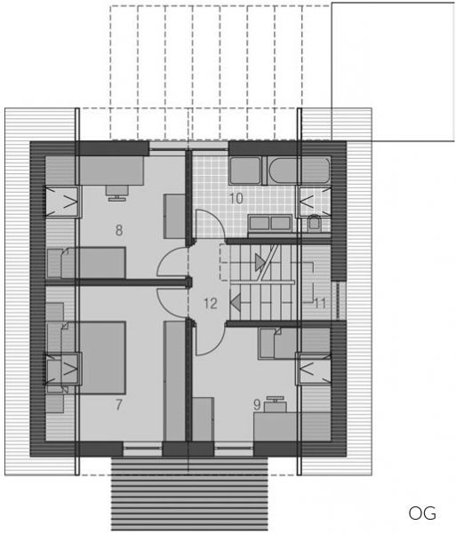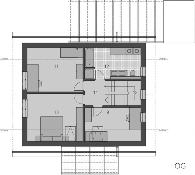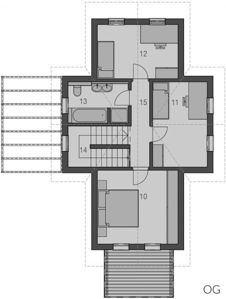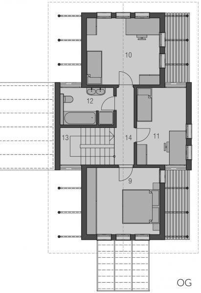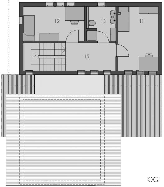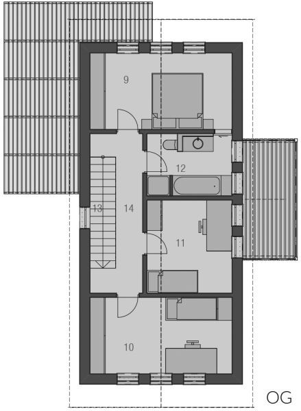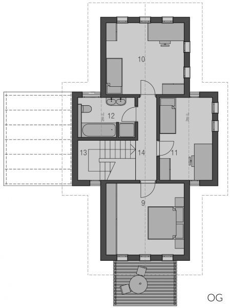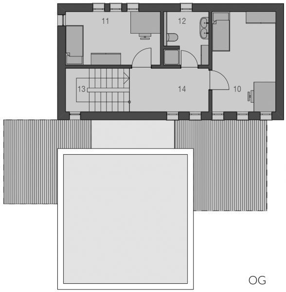 Langgestreckt und elegant ist der Baukörper des Haustyps "Sonnendeck" sonst sehr kompakt gehalten, mit geringem Dachüberstand und zurückhaltenden Auskragungen. Im Inneren erlaubt der sehr gerichtete Baukörper eine sehr spannungsvolle Raumanordnung, die bei klarer Zonierung trotzdem Großzügigkeit atmet - mit langen Fluchten und interessanten Blickbezügen, die sich bis nach Außen fortsetzen. Das obere Geschoss gehört ganz der Familie. Hier finden, erschlossen über einen großzügig zum Treppenhaus angeordneten Flur, Tageslichtbad, Eltern und zwei Kinderzimmer Platz.
