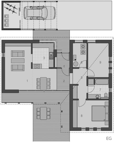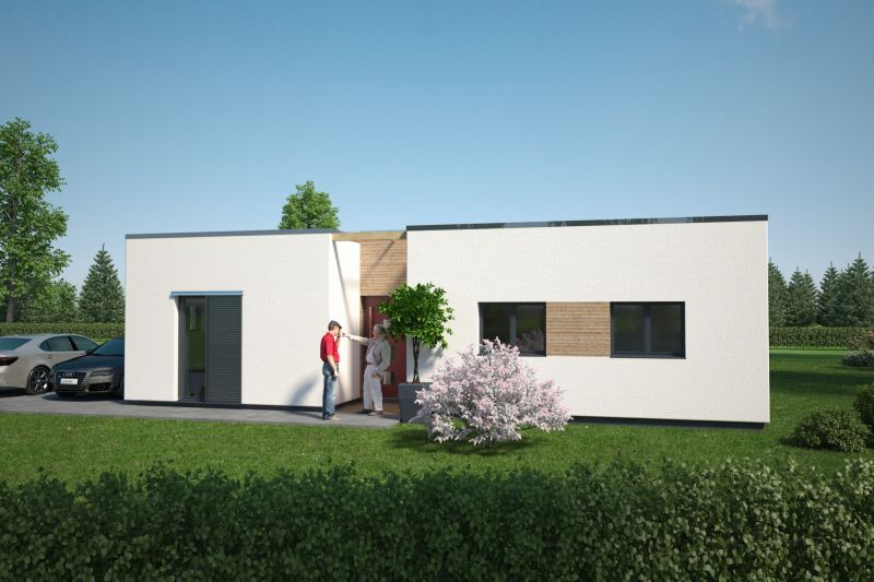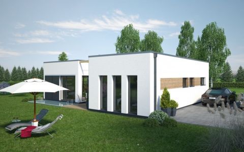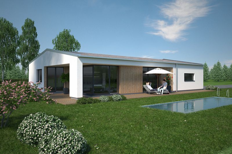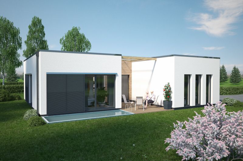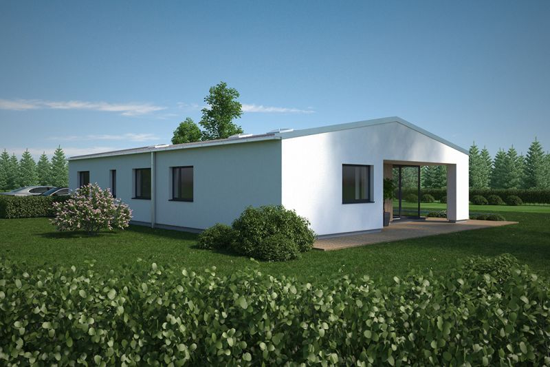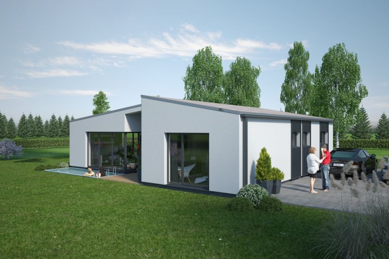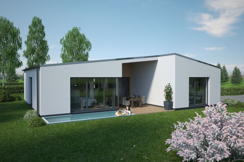Der Haustyp "Leuchtfeuer" verbindet die Ideen modernen Wohnens mit den Vorzügen eines eigenständigen Eigenheims auf einer Ebene. Unter Verzicht auf ein Obergeschoss bietet dieser Haustyp trotzdem besonders vielschichtige und interessante Raumbezüge – privatere Bereiche und Wohnbereich werden konsequent getrennt. Eine mittlere Achse bildet neben einem geschützten Eingangsbereich einen besonders qualitätvollen geborgenen Freisitz, dem Wohnzimmer zugeordnet. So verwirklichen Sie als Single oder auch als Paar den Traum vom modernen Wohnen.