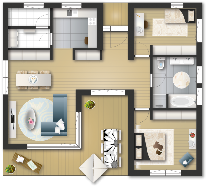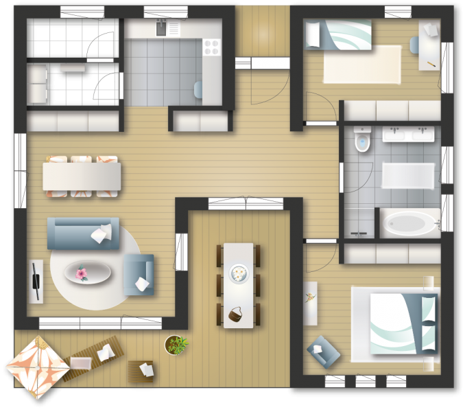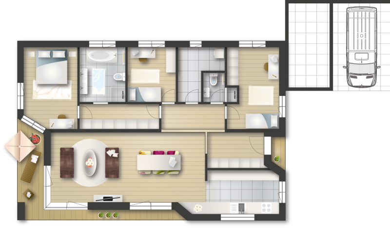 Erleben Sie die Vorteile dieses zweiteiligen Grundrisses: Das gemütliche Beisammensein der Familie im Ess- und Wohnbereich und die Ruhe in den eigenen Zimmern. Mit seinen optimalen Verkehrsflächen wirkt das Haus "Sommerbrise" großzügig. Zusätzlich sorgt die integrierte Terrasse für einen Raumfluss zwischen Innen und Außen. Man holt sich sozusagen die Natur ins Haus. Es ist eine Freude in diesem Haus zu leben und alt zu werden.